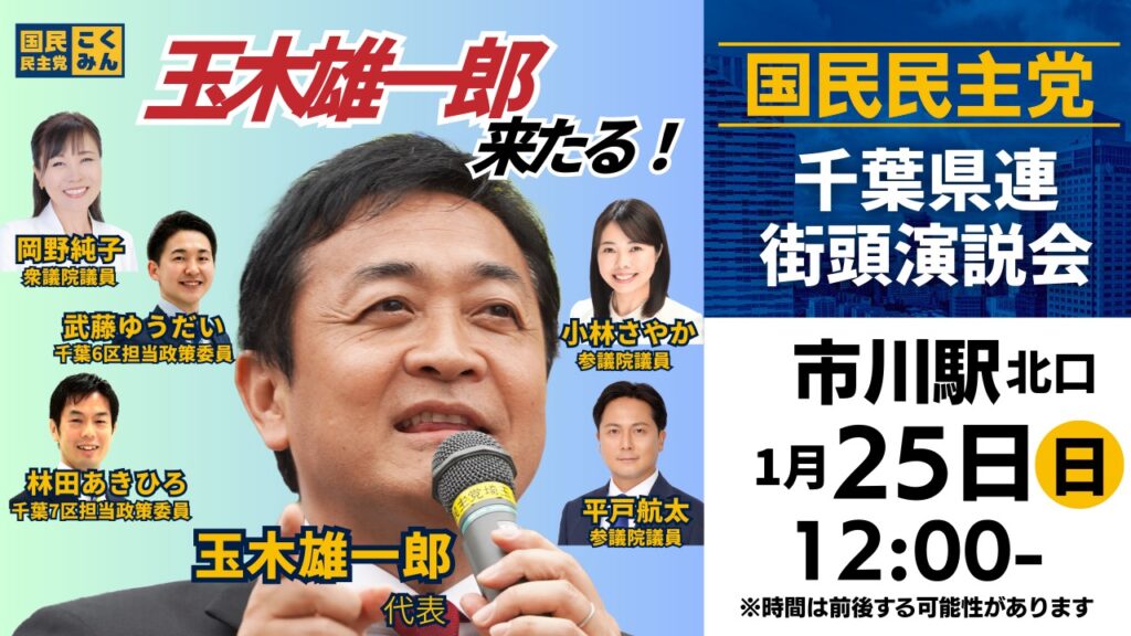 1月25日(日)玉木雄一郎来たる!(市川) 2026-01-23 最終更新日時 : 2026-01-23 newkokuminchibajp 1月25日(日)12時より市川駅北口にて玉木雄一郎代表による街頭演説会を開催いたします。 是非、国民民主党の『もっと』手取りを増やす!!政策をお聴きください!! 多くの皆さまのお越しをお待ちしております。